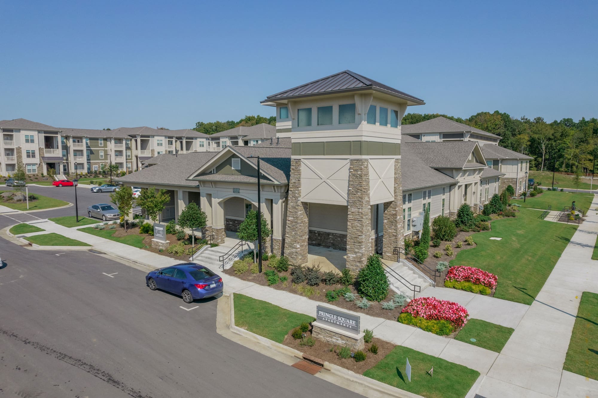 The Pringle Square Apartments is located in the Steele Creek area of Charlotte, North Carolina. The project houses 292 residential units within 18 buildings. Pringle Square boasts in-demand amenities such as a yoga studio, spacious pool complex with fully-equipped outdoor kitchen, an outdoor lounge area with fire feature, car wash, dog spa and dog park.